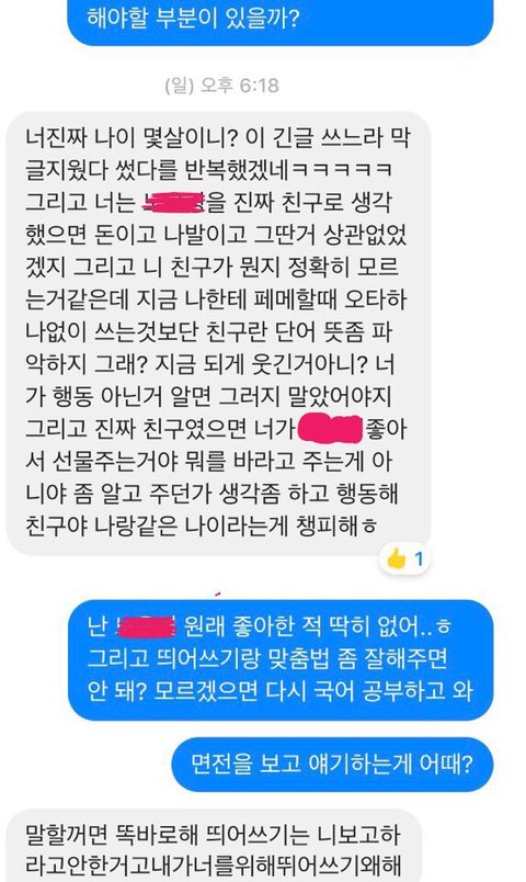 그런데 올해 그 친구와 관계가 괜찮아져서 달라고 단톡방에 말을 했습니다. 그런데 계속 안준다고 하다 욕까지 하길래 제가 갠톡으로 동생들도 있는데 왜 욕을 하냐고 가오 부리냐고 왜그러냐고 하니까 주기 싫다고 니한테 받은게 없는데 왜 주냐고 이러는겁니다.