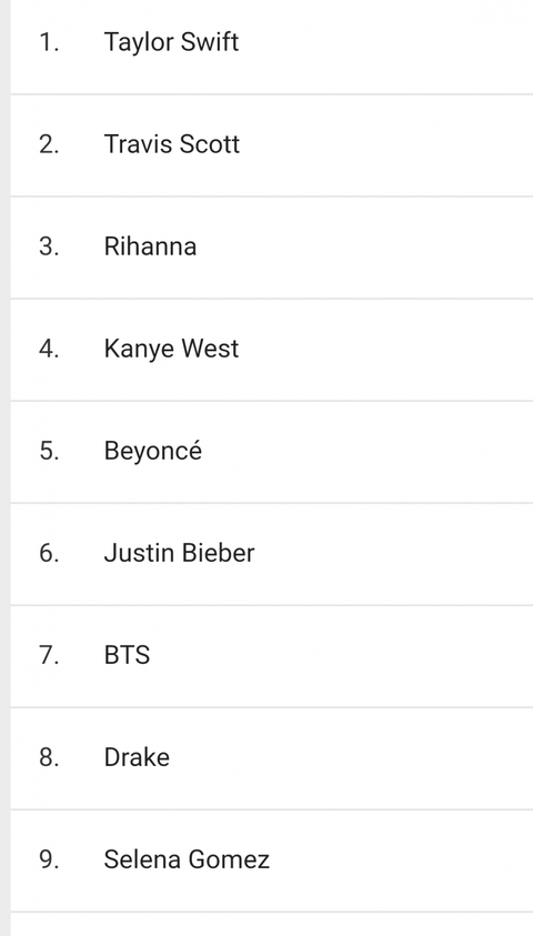 순위도 순위인데 라인업이 개짱짱하네 ㅋㅋㅋㅋㅋ 테일러 칸예 비욘세 드레이크 셀레나 비버 워,,