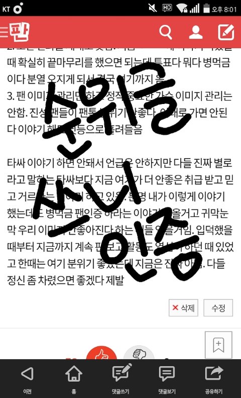 팬톡 분위기 쭉 보다가 어이없어서 글 쓴다ㅋㅋㅋㅋㅋ 나는 그래도 내 글 보고 공감하는 사람들도 좀 있고 그래서 여기 사람들 정신 차릴 줄 알았는데 다른 글 보니까 어떤 사람이 타싸 아미와 판아미 선긋고 판일은 알아서 해결할거니까 신경끄라고 이야기하더라...