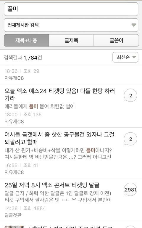 대충 감이 오겠지만 위 사진은 전부 여성시대 커뮤니티 애들임. 엑소티켓팅을 해서 티켓팅에 성공하면 플미를 붙여서 판 후 그 돈으로 치킨을 먹을것이다, 여행을 갈 것이다, 고소당하면 합의금으로 낼거다. 등 이딴 개소리를 시전중임..