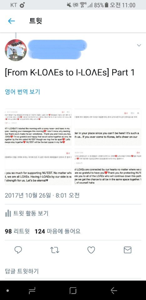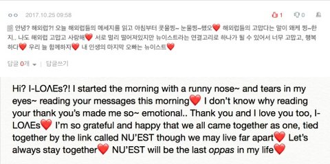 요 며칠간 한국럽들이랑 외국럽들 사이에서 서로의 마음을 전달할 수 있는 기회를 마련하면서 정말 행복했어. 힘든거 하나도 없었고 메세지 하나하나 번역하면서 정말 내가 이 사람들이랑 같은 길을 걷고 있다는게 너무 좋고 행복한거 있지? 나도 이번일 통해서 힐링도 많이 했으니까 정말 고마워 ^^