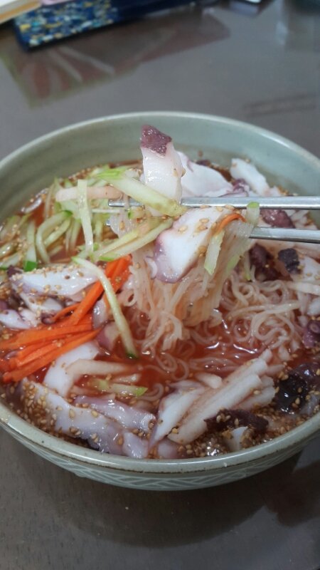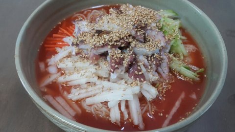 시판 냉면육수에 초고추장 풀고