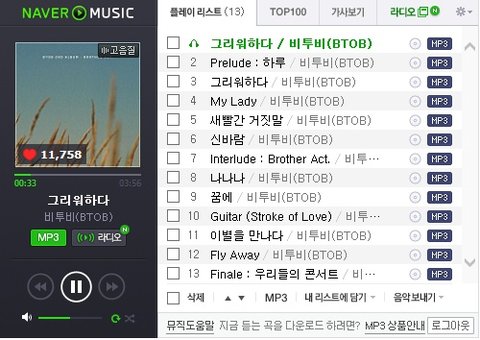 평소랑 같이 네이버 뮤직 순위권 노래듣다가