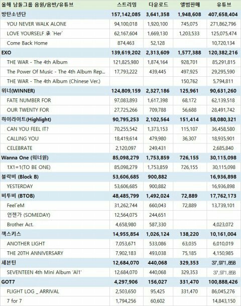 2017년 발매 기준 남돌 성적기록표래