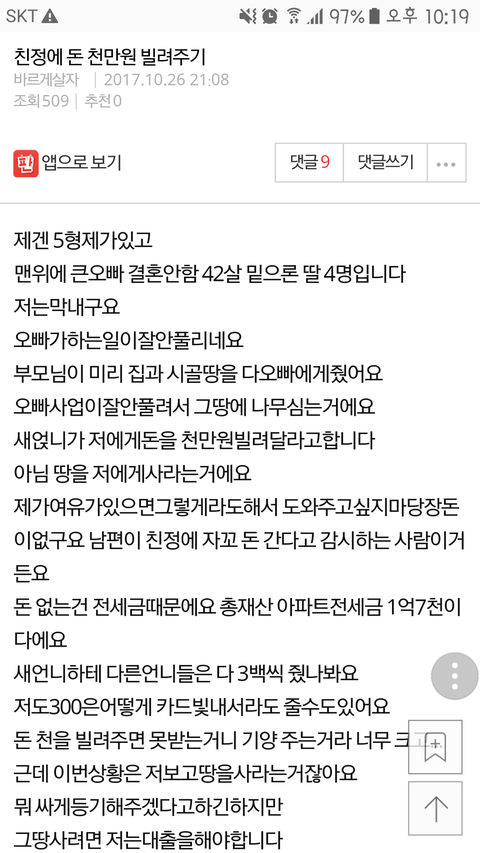 저보고사라구요 오빠랑 새얹니 힘든데 우리가 돕자고요 다른언니들은 다들 자가 아파트여서 대출을다끼고있어더이상대출이어렵다고하네요