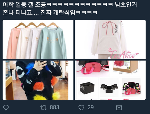 지 와이프 생일 선물로 반찬통 해주고 여친 기념일 선물로 다이소 면봉 사주는 새끼들이 덕질하니까 저런 사태가 일어나는거임ㅋㅋㅋㅋ