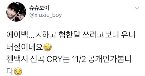 (시우민)첸백시 신곡 CRY 11월2일 공개래