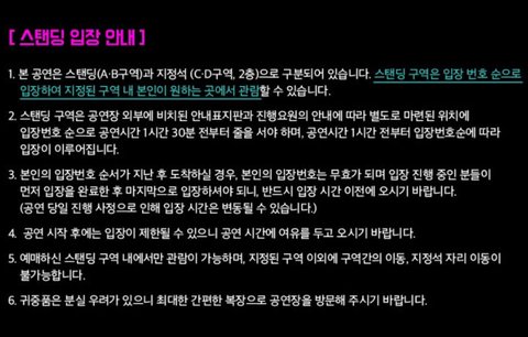1시간 30분부터 줄서서 입장준비한다고 나와있는데 줄 서기전에 물품보관소를가야하나..? 아 그리고 혹시 스탠딩가는 베뷔들 늦지않게 조심해야할듯! 늦으면 마지막에 입장하네..