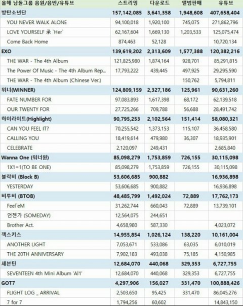 2017 여돌 남돌 다운로드,스트리밍 순위 최신판ㄷㄷ