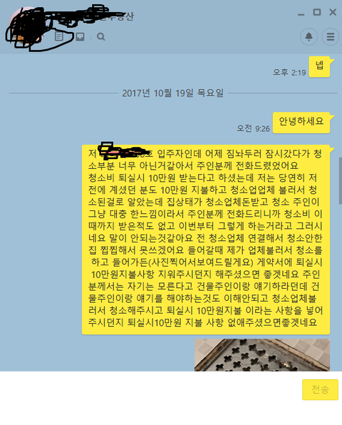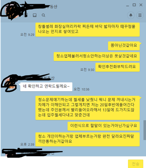 그 이후 주인과 부동산 관리실분 저 이렇게 통화를 했는데 부동산 중개인분께서 중간에서 말전달하면서 주인은 싫다. ㄱㅖ약서수정못한다. 저는 억울하다 내가왜 더러운집 들어가서 살면서 또 나갈때 돈을 줘야하나. 청소했다고 안내한 그쪽잘못도있지않느냐 주인한테 말해서 들어갈때 청소비(복층에 15평이라 22~25만원선) 내가 지불하고 나갈땐 안내겟다.아니면 청소업체불러주면 나갈때 계약서대로 하겠다. 하니주인께서 완강하시다고 그냥 이해해라는 식이였습니다. 도저히 안되서 주인한테 전화하니 다짜고자 소리지르면서 이 내용과는 무관한 전세입자 얘기를 하면서