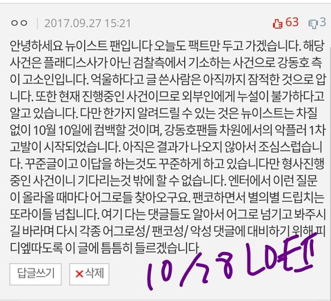 다시 한 번 말하지만 나는 무혐의, 무죄가 나오길 바라는 사람이고 여전히 팬이야. 그리고 플디 전화 팩스 메일 전부 연락 불가임.