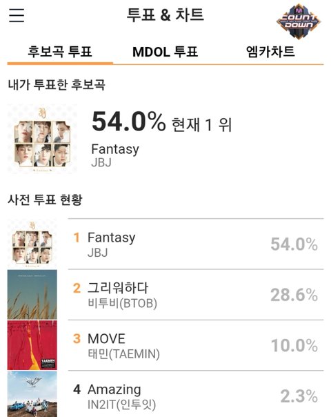 엠키운트다운 홈페이지 들어가서 jbj투표좀 해주세요ㅠㅠㅠㅠ지금까진 1위긴 한테 투표율이 너무 빠르게 줄어들어요ㅠㅠ제발 투표해주세요..