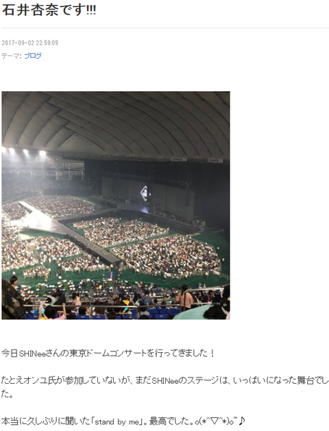 이시이 안나입니다. (^ ∀ ^) 오늘 SHINee의 ARENA TOUR 스빠아리 공연을 다녀왔습니다. 정말 멋진 멋진 공연이었습니다! 3 만석 이상 가득찬 관객석도 장관이었습니다. 오늘 최고의 무대는 Dream Girl을 일본어로 번안 해 부른 무대였습니다. 어떻게 저렇게 무거운 스탠딩 마이크를 가지고 완벽한 LIVE 구사가 가능한 것일까요. 곧 발매되는 새 싱글 BOY 'S MEET U 무대에서 태민 군의 귀여움 당분간 잔상으로 남을 것이라 생각합니다
