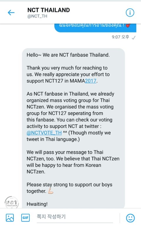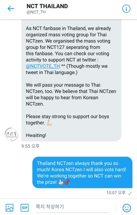 As NCT fanbase in Thailand, we already organized mass voting group for Thai NCTzen. We organised the mass voting group for NCT127 seperating from this fanbase. You can check our voting activity to support NCT at twitter : @NCTVOTE_TH ^^ (Though mostly we tweet in Thai language.)