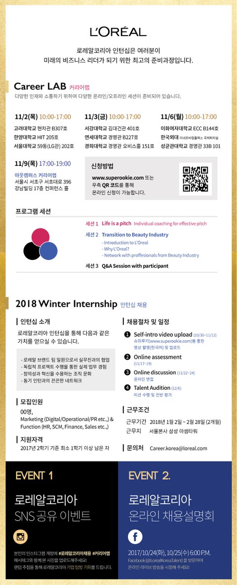 [특별한 로레알 채용설명회 Career LAB이 열립니다.] 안녕하세요, 로레알코리아의 특별한 채용설명회 Career LAB에 여러분을 초대합니다. 소규모 채용 멘토링 형식으로 진행되는 이번 설명회는 11월 2일부터 11월 6일까지 서울 내 주요 9개 대학교에서 진행되며 한정된 인원(30명)만을 초대하는 특별한 채용 설명회입니다. 여러분의 많은 참여 바랍니다. *2018년 신입 채용 시 금번 인턴십 수료자에 한해 채용할 예정이며, 해당 학교 학생 외에도 신청 가능합니다.