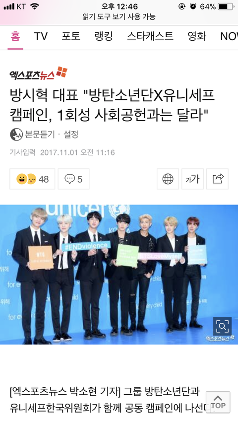 아무리 인기 많은 연예인이지만 5억을 회사와 같이 선뜻 기부한다는 일이 쉬운일이 아니잖아 정말 대단한거같아 방탄