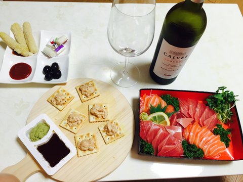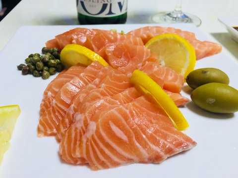 2년전부터 미친듯 좋아하고 있는 생연어회는 거의 주식으로... 화이트와인과 함께!