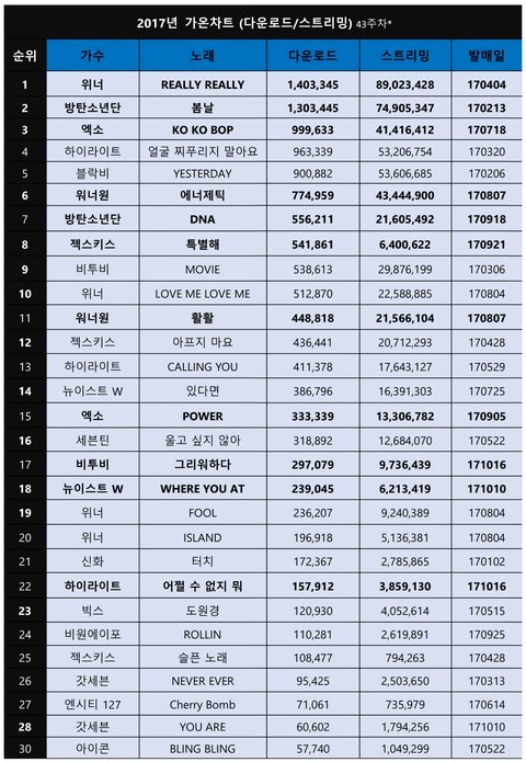 2017 남돌 다운로드,스트리밍 순위 최신판