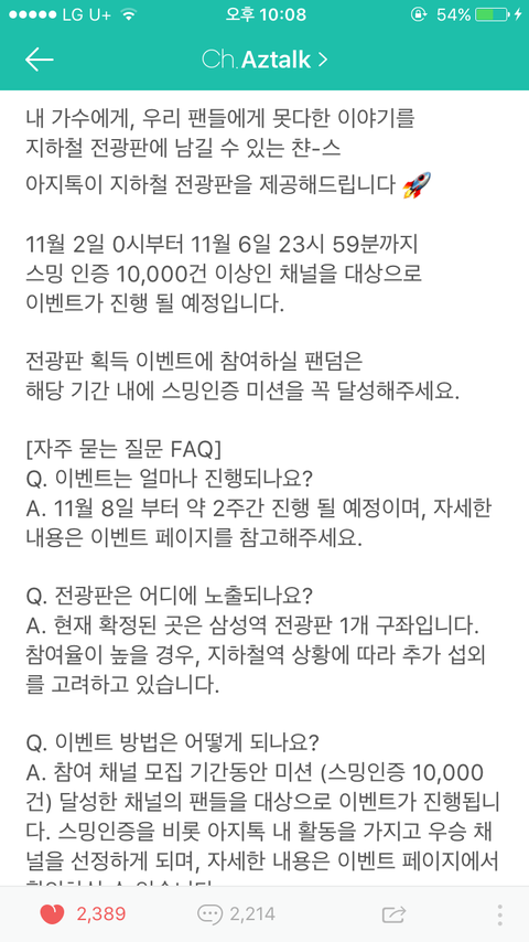 11월 6일까지 아❤️지토크 스밍인증 10000건 이상인 돌들 광고 노출시켜준대