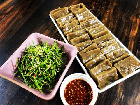 도토리묵 썰고 양념장 만들고 영양부추 무치고ㅎㅎ