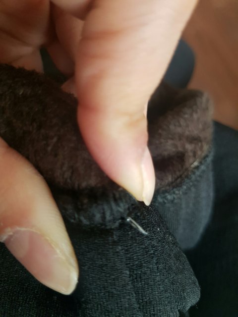 바지 안쪽을 보니 뭐가 반짝반짝해서 보니 깨진 바늘이 실밥에 걸려 있었습니다