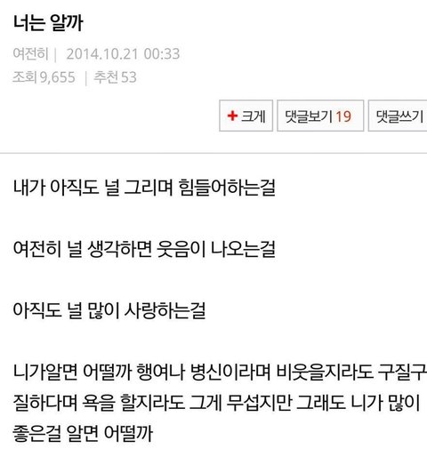 이때까지 남친이 있었긴했지만 그 애처럼 이렇게 기억이 오래남은적은 없거든요.. 더 오래사귄 전전남친도 잘잊고 친구처럼지내고있는데 그애는 아직도 기억이남고 뭐할때마다 그애가 저한테 한행동 한말들이 게속 생각나더라구요 전남친이랑은 2달쪼금 넘게 사겼는데 전남친들이랑은 더 오래사겼었거든요 근데 걔들하고는 친구로 지내는데 걔랑은 저만 어색해하고 장난쳐도 받아주지못하고있어요