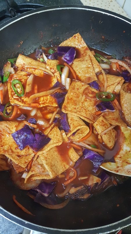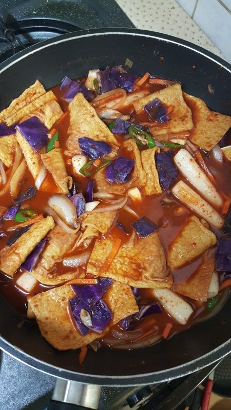 멸치다신물, 떡, 양파, 자색양배추, 풋고추, 당근,어묵,후추,간장조금, 소금 조금, 고추장과 고춧가루, 식초1~2방울, 꿀이나설탕+물엿