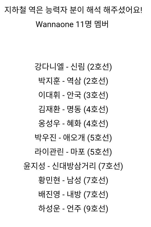 이거 앨범 시크릿 코드인데 해석하면 멤버 이름하고 지하철 역 이름이라고 그러네 쟈철 역 이름은 어케풀어서 나온건지 아는 녤부리 있어?????