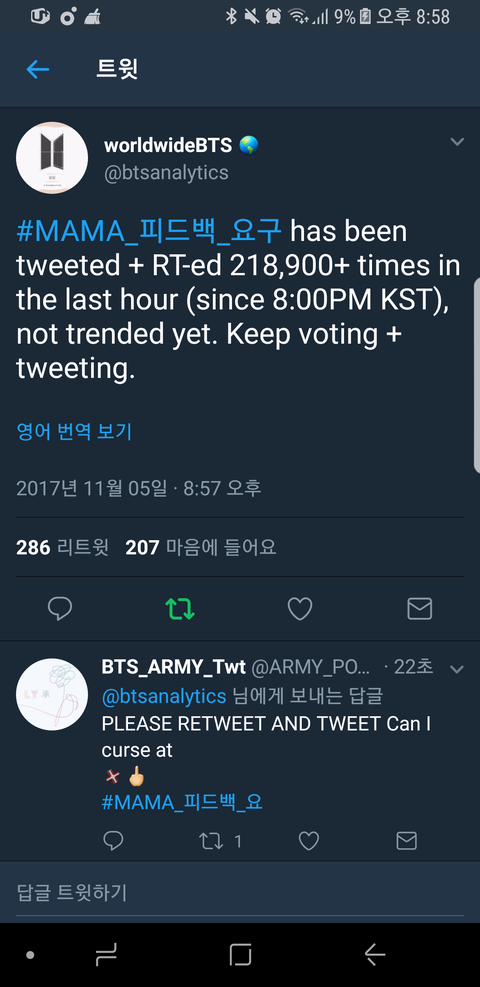 트위터에서 'MAMA' '피드백' 등 특정단어가 들어간 해시태그가 실트에 올라가는걸 막아놓음 방탄팬들이 실트총공 시간까지 잡아서 #MAMA_피드백_요구 실트총공 했는데 21만트윗이 넘었음 그런데 실트 안올라감 그래서 #불타오르네 하니까 일분만에 올라감 많이 이상하지않음?