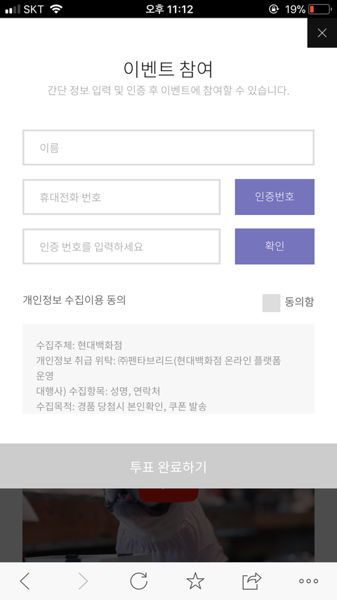 통화중인데 다짜고짜 들이대서 정확한 설명도 없이 개인정보를 달라고 하는게 어이없었지만 저도 강아지를 키우기도하고 기프티콘을 준다고하길래 그래 그냥 기프티콘 받는셈 치자 하고 제 핸드폰 번호와 이름 넣고 인증을 해주었습니다.