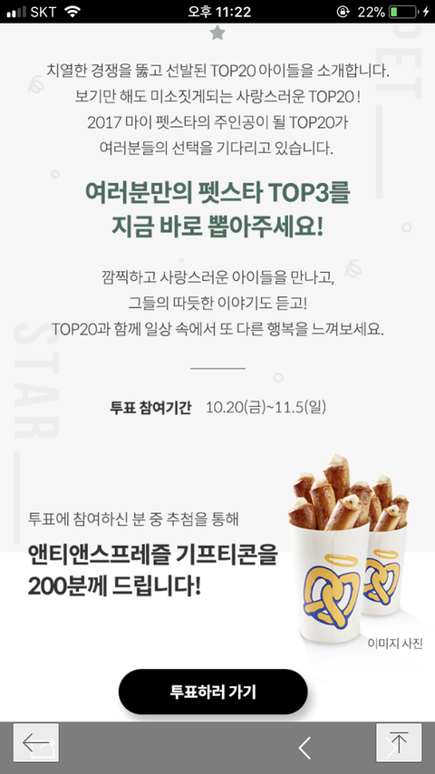 강아지 정보를 보니 sns스타라고 하더군요. 본인들에게 1등이 중요할 수 있겠지만, 정확한 정보도 없이 그저 인증화면만 들이대며 싫다는 사람에게 무조건 기프티콘을 준다고 거짓말을 해가며 투표를 받아야하나요?