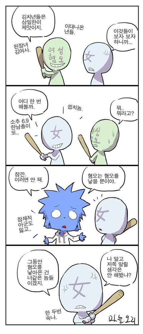 우리는 이제 조금씩 김치녀 틀에서 벗어나기 시작했어. 그럼 또 이러겠지. 김치녀 대신 메갈녀가 생겨났잖아.