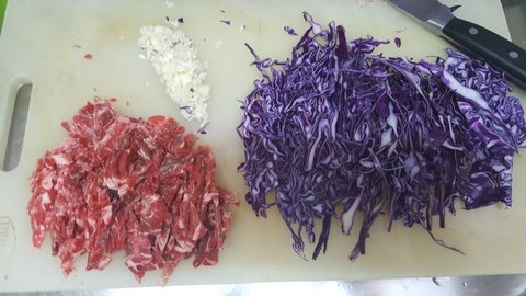 고기랑 야채를 원래 같은도마에 두고 같이 두면 안되지만 소고기이기도 하고 , 할머니께서 배고프다고 하셔서 그냥 같이 써버렸어요