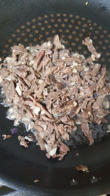 다져둔 마늘과 소고기 , 후추를 같이 볶아줍시다!!