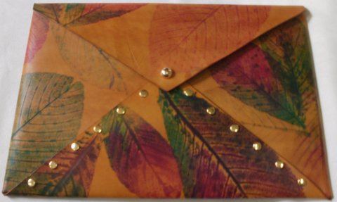 가죽에 손염색하고 나뭇이 패턴을 수작업으로 내추럴하게 프린팅하여 리벳과 스냅만으로 간편하게 제작한 포스트백입니다.(madisaart)