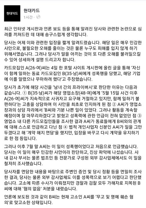 (1) 남-여 둘 다 영업소 위촉직 카드모집인(개인사업자) (2) 여자가 남자에게 계속 들이댐 (3) 돌싱인 남자가 안 받아주니까 성폭행으로 고소 (4) 경•검찰 남자 무혐의 처분 (명백한 화간으로 판명) (5) 이후 남자가 '무고 및 명예훼손' 역고소 (6) 후달린 여자가 네이트판을 이용한 인민재판관들에게 호소 명백한 증거를 줘도 판년이 쓴 글이 무조건 옳아 빼애액!! 하는 유사인류들ㅋㅋ 무슨 지들 말이 곧 법도 아니고 인정 못하고 남자탓 회사탓 오졌지요.