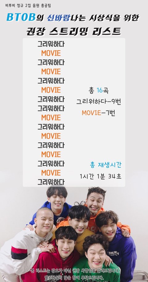 우리 권장스밍리스트바꺘어!! 연간차트땨문에ㅠㅠㅠㅠ 스밍은 한시간에한번집계되지만 연간은 횟수가 중요한거알지...? 되도록이면 연말까지라도 비투비노래에 최선을다하자ㅠㅠㅠ(무슨소린지 알지..?)