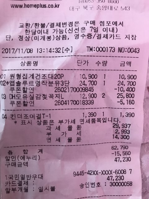 영수증 보면 할인은 분유 할인이 만원 인데 실제보면 할인 되게 아니고 인터넷하고 비교해보면 살짝 더 비싸요.. 분유도 현재 최저가보다 4천원 더 비싸고..