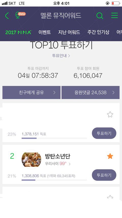 ✔️멜롱 탑텐: 1위와 69,345표 차이 (-655표)