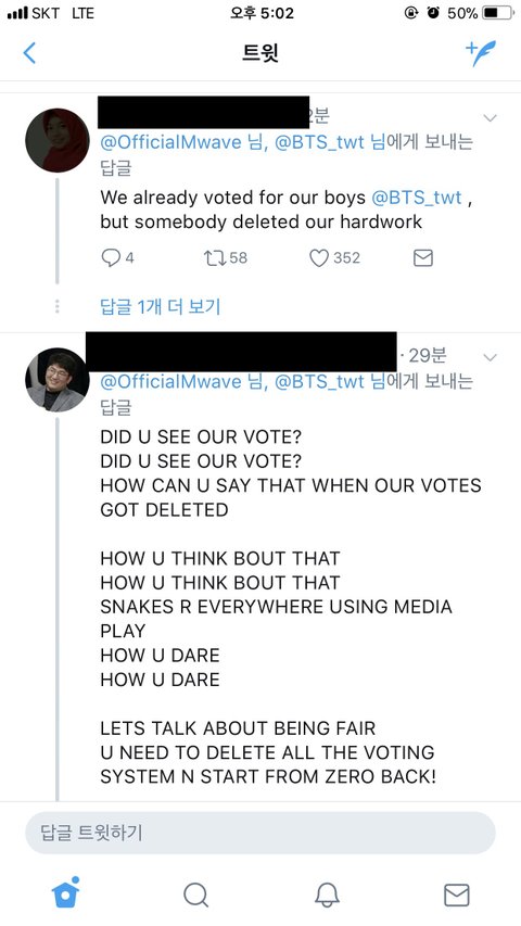 이런 인간말종쓰레기 것들 ㅉㅉ 팬들을 붕어리 취급하면서 지들 이익 취하는데 약아빠진것들임 피드백 요구엔 대놓고 무시를 하더니 ㅋㅋㅋㅋㅋ너넨 이제 우리팬덤한테 투표하라 마라도 하지마 농락하는 것도 적당히지