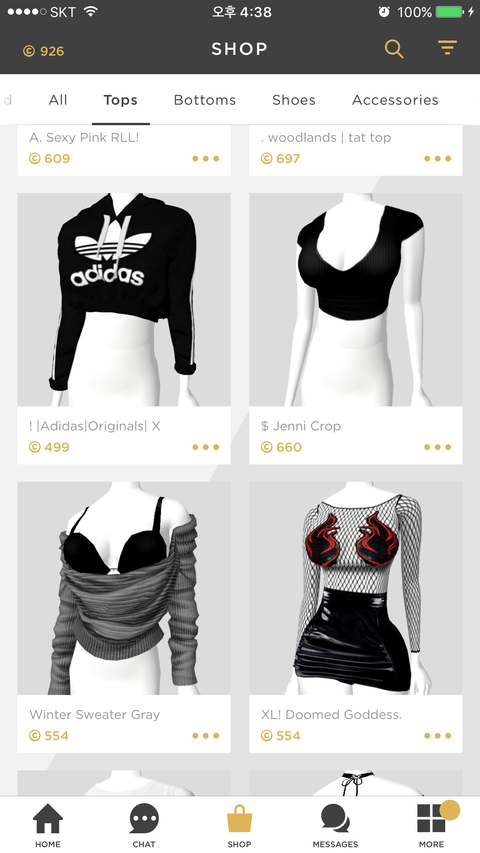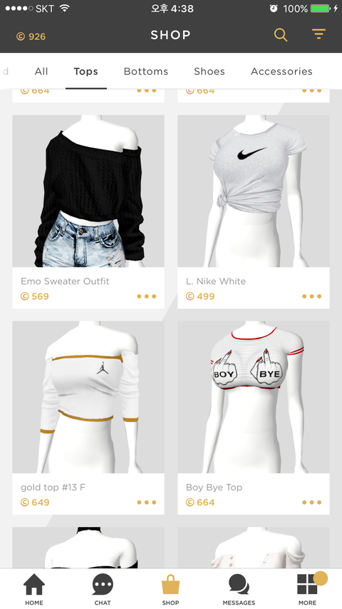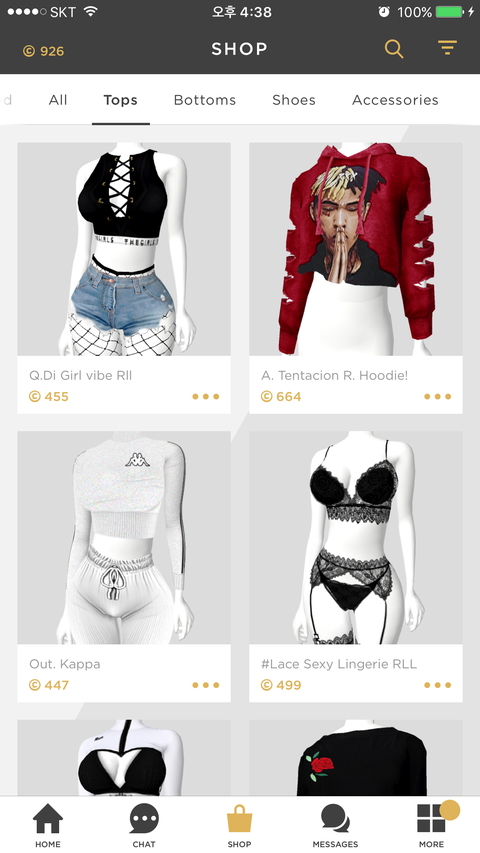 살수 있는거 알려줄게 상의. 하의. 신발. 아바타 얼굴. 헤어스타일 . 악세사리. 문신. 눈색깔. 화장법. 네일. 그리고뭐 너무디테일하게많아서 다 못나열하겟음.. 근데 종류 조카많고 진짜 이쁜거 개많아 사진에 야한옷이 많짘ㅋㅋㅋ 이거 미국에서 만든게임이라서 미국애들 취향이 많이 반영되서그래..그래서 노출익는옷이 70퍼임 약간미국정서랑안맞는애들은 감안해야됨ㅋㅋㅋ