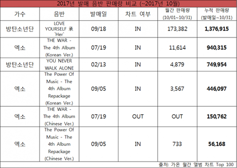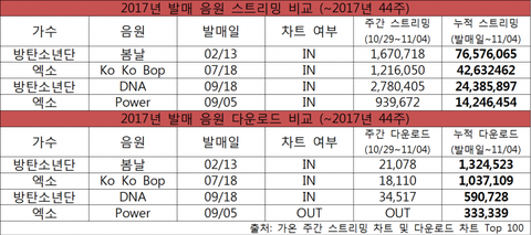 방탄vs엑소 2017년 성적 정리