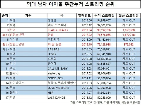 킹왕짱이 와쥐 빅뱅, 위너, 아이콘이고 그 다음이 빅힛 방탄이네? 이야 방탄 성적 이렇게 높을 줄 몰랐음.. 방탄 노래는 오래 가는 듯? 피땀 보니. 위너 릴리 또한 개띵곡... 1억 스트리밍 금방 갈 듯