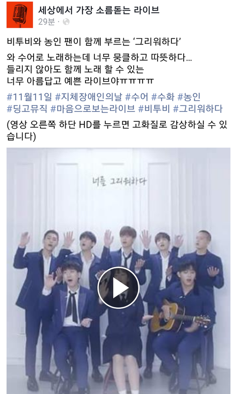 지체장애인의 날을 맞아 11월 11일 11시 11분에 올라온 비투비와 농인인 팬이 수어(수화)로 부르는 그리워하다.. 너무 아름답고 따뜻해! 노래소리 끄고 들으면 또 다른 느낌이니 한번 들어보길 바라