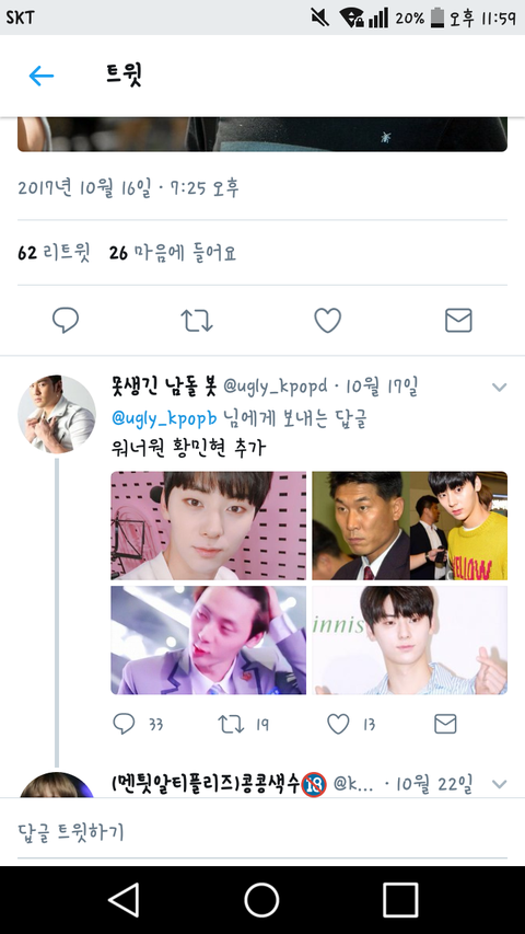 까다까다 박지훈 손동운 디오 런쥔 유타 마크 하성운 지디 강승윤 시우민 이런애들도 못생겼다고 깜ㅋㅋㅋㅋㅋㅋ 심지어 안형섭을 깔 사진이 없으니까 겨털사진가져와서 깜ㅋㅋㅋㅋ 박지훈도 다리사진가져와서까고ㅋㅋㅋㅋ 첨엔 욕할려고 들어가봤는데 개쳐웃으면서나옴ㅋㅋㅋㅋㅋㅋ