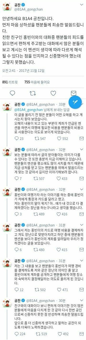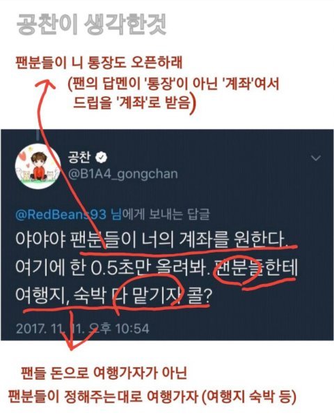 카드를 보내는거랑 계좌를 올리는게 어떻게 같냐? 이걸 어떻게 혼동하냐? 말이 되는소릴해야지. 카드는 돈을 쓰는 용도고 계좌는 돈을 받는 용도야. 이걸 헷갈린다고?? 팬들한테 여행 경비 내달라는 의도 맞고 욕먹으니까 말도안되는 논리로 지어내는거야. 계좌를 공개하라는게 팬들에게 둘중에 누구 통장으로 경비쓸지 결정해달라는 뜻이라고? 그런 선택을 대신 해달라는건 계좌 공개 안해도 가능한거 아냐? 계좌 공개를 통해서 할수있는게 입금말고 있어? 뻔뻔하게 거짓말로 해명하는거 진짜 환멸이다. 차라리 실수 인정하고 사과하는게 낫지. 홍빈이 먼저한 농담을 그대로 받아친거다?? 아니지 홍빈은 카드와 통장을 달라고했지. 그리고 그건 실물 카드와 실물 통장을 보내라는거고. 쟤가 "계좌를" 올리라고한건 말그대로 팬들한테 입금시키자는거지. 그걸지금 해명이랍시고 아니었다 혼동했다 거짓말하는거잖아.