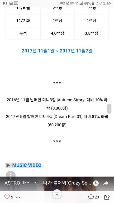 아스트로 저번앨범 사재기 의혹 있었는데 음방 1위 못하고 듣보라 그냥 묻혔잖아... 저번앨범 초동 마지막날에 5400장 팔더니 초동기간 끝나자마자 바로 다음날에 판매량 350장으로 떨어짐ㅋㅋ...
