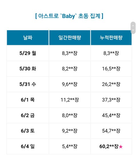 엥 베이비 저때 초동 되게 이상하네.. 초동 6만장이면 하이라이트 인피니트 비투비 빅스 정도 초동인데 아스트로가 그만큼 팔았다고..?