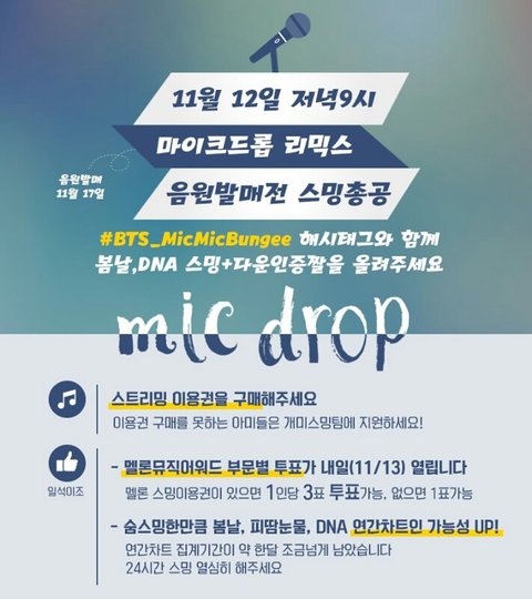 12일(일요일) 저녁 9시 스밍 총공 곧 17일 MIC DROP 리믹스 음원이 발매되는 날이니까 스밍장전해두고 리믹스라도 순위 상위권이게 열스밍하자 #BTS_MicMicBungee