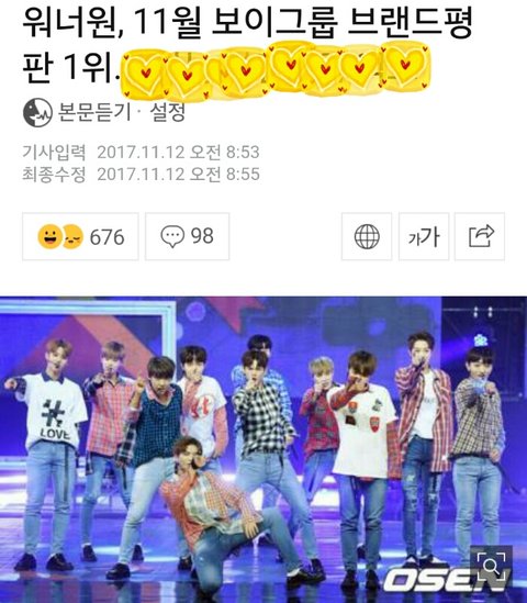 기사) 워너원, 11월 보이그룹 브랜드평판 1위